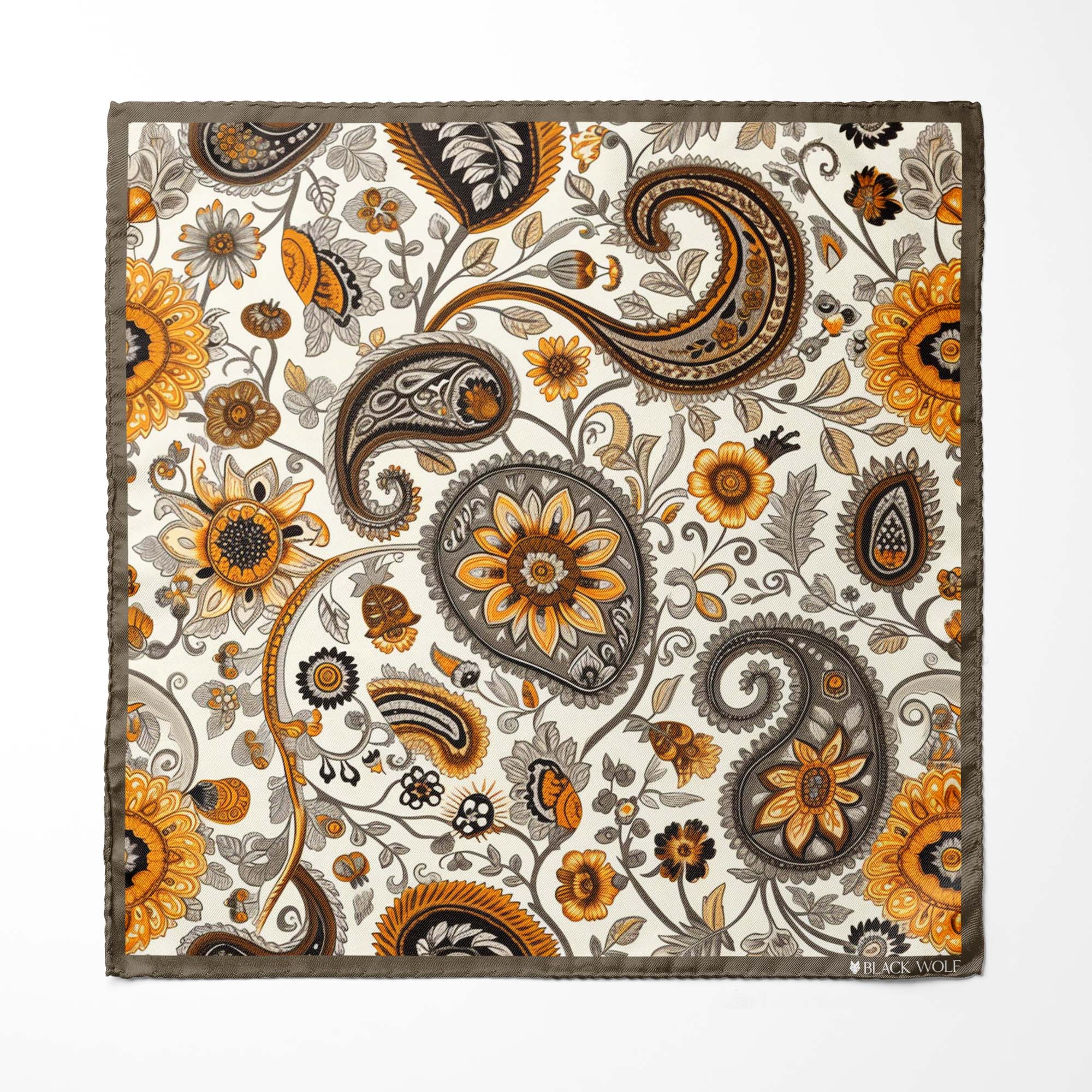 Sophisticated pocket square adorned with an intricate paisley and floral design. This elegant piece showcases a harmonious blend of orange, yellow, brown, and gray against a crisp off white backdrop. Perfect for adding a touch of sophistication to any outfit.