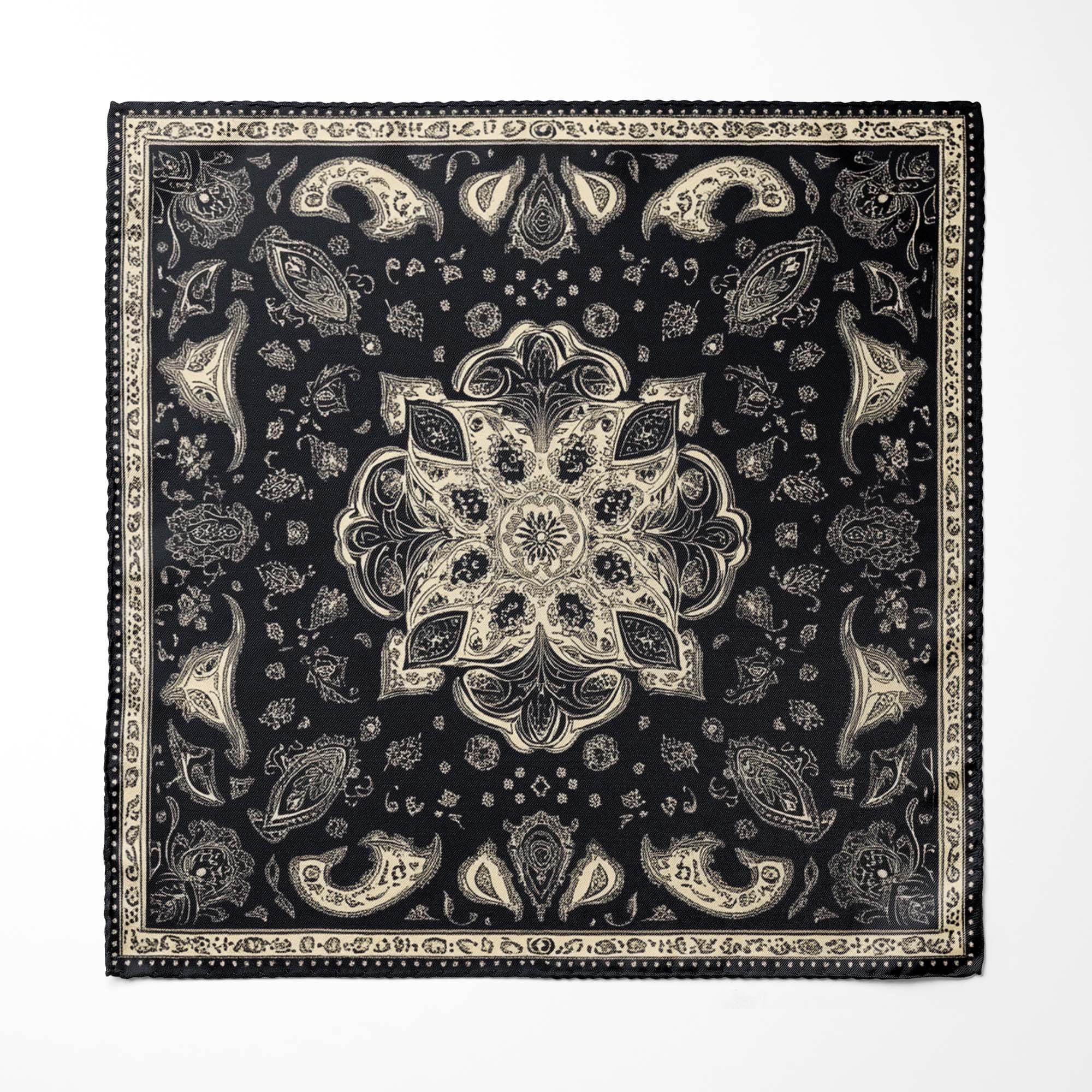 Sophisticated black pocket square, featuring intricate paisley and floral patterns in beige and cream, exudes timeless elegance and contemporary flair, ideal for men's suits and coat pockets.