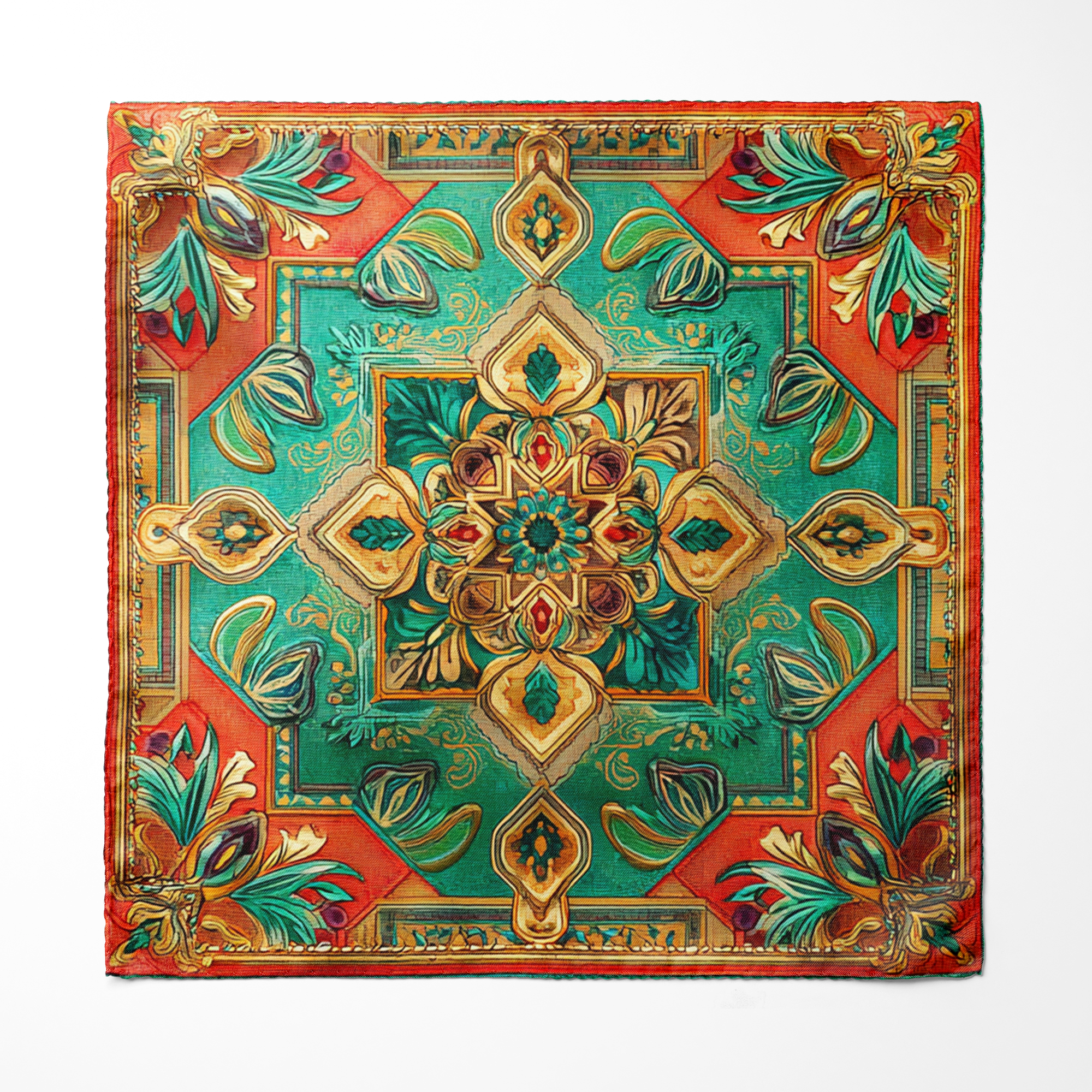 An opulent silk pocket square inspired by Andalusian tilework, featuring a radiant starburst medallion framed with arabesque flourishes. Rich tones of emerald green, scarlet, and gold celebrate Moorish architecture with a contemporary elegance—perfect for refined styling and cultural depth.