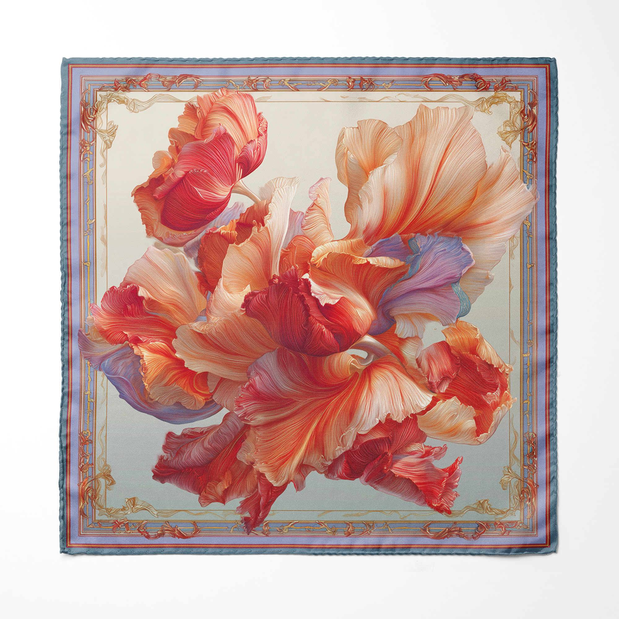Sophisticated pocket square in ivory, coral, and soft lavender tones, showcasing a bold bloom of intricately layered petals framed by an art nouveau border—striking a perfect balance between elegance and vibrance.