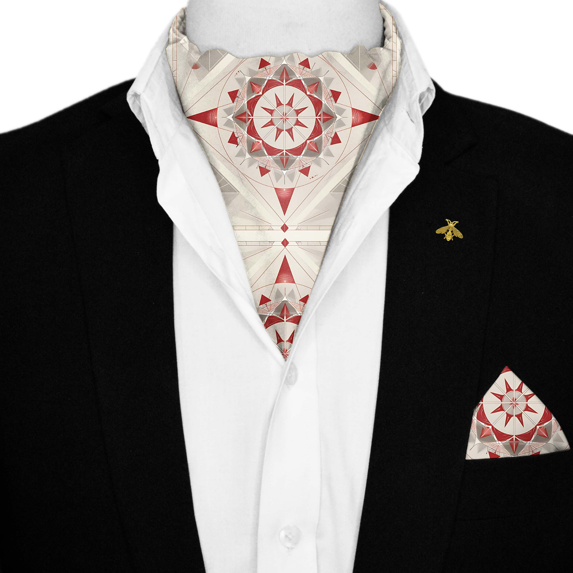 BEAUTIFUL STAR GEOMETRIC SILK ASCOT WITH LAPEL PIN AND POCKET SQUARE