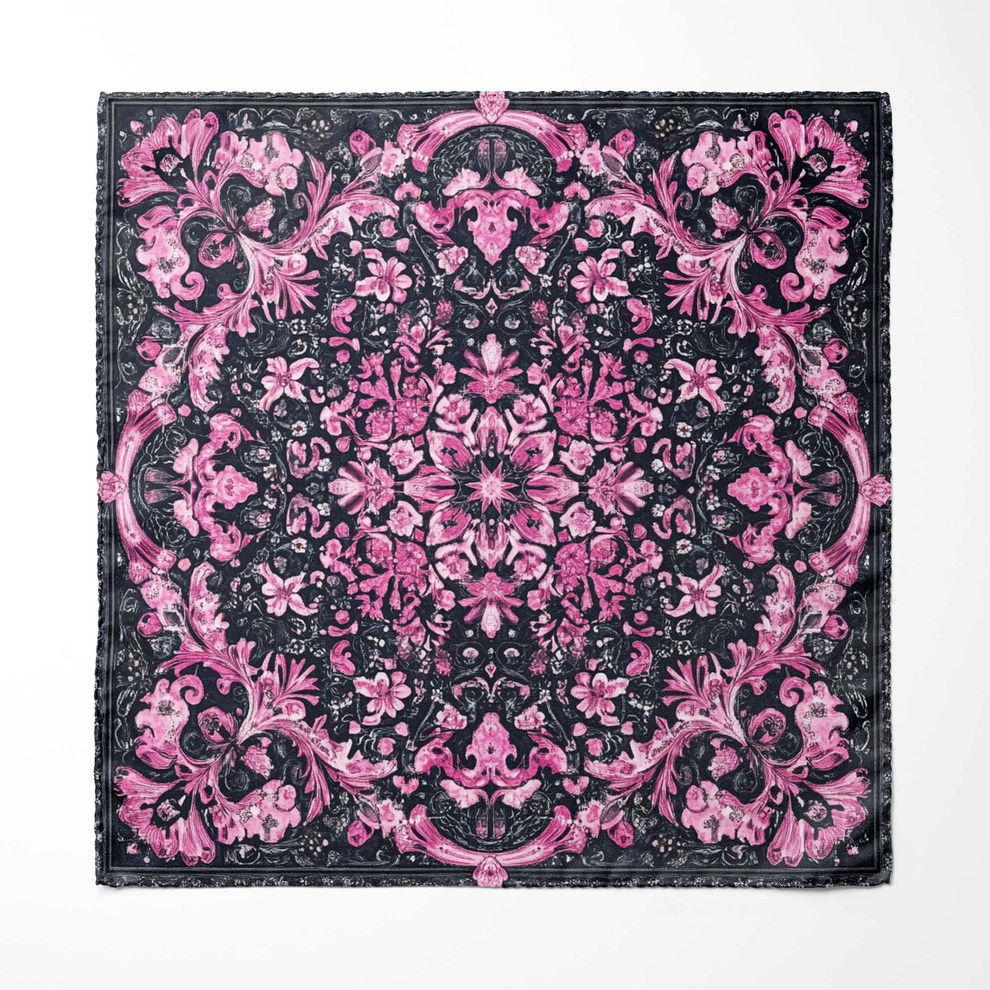 Sophisticated pocket square in shades of pink and black, featuring an intricate floral pattern with elaborate scrollwork, exudes elegance and versatility, perfect for enhancing any suit.|