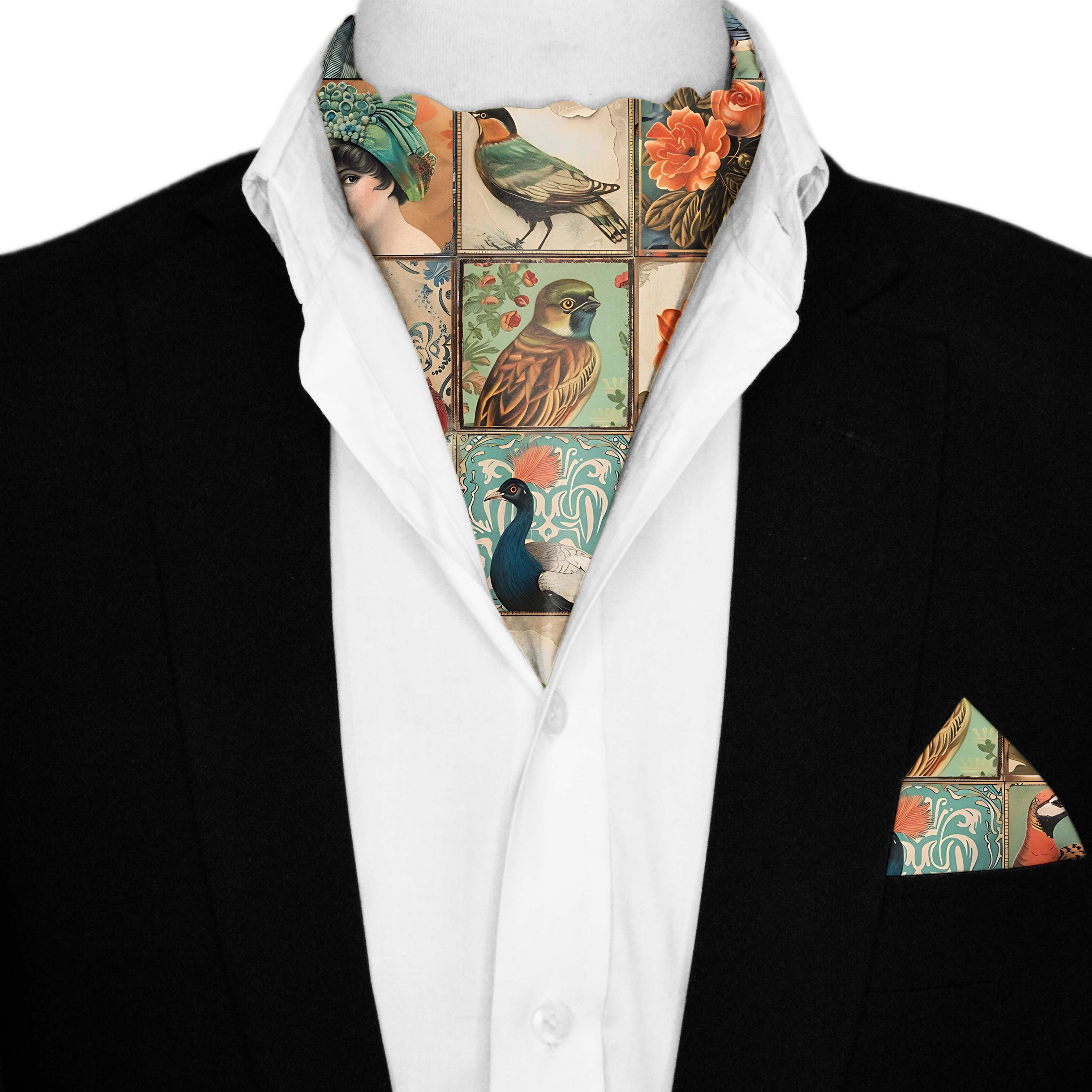BIRD COLLAGE SILK ASCOT AND POCKET SQUARE SET – PREMIUM COLLECTION