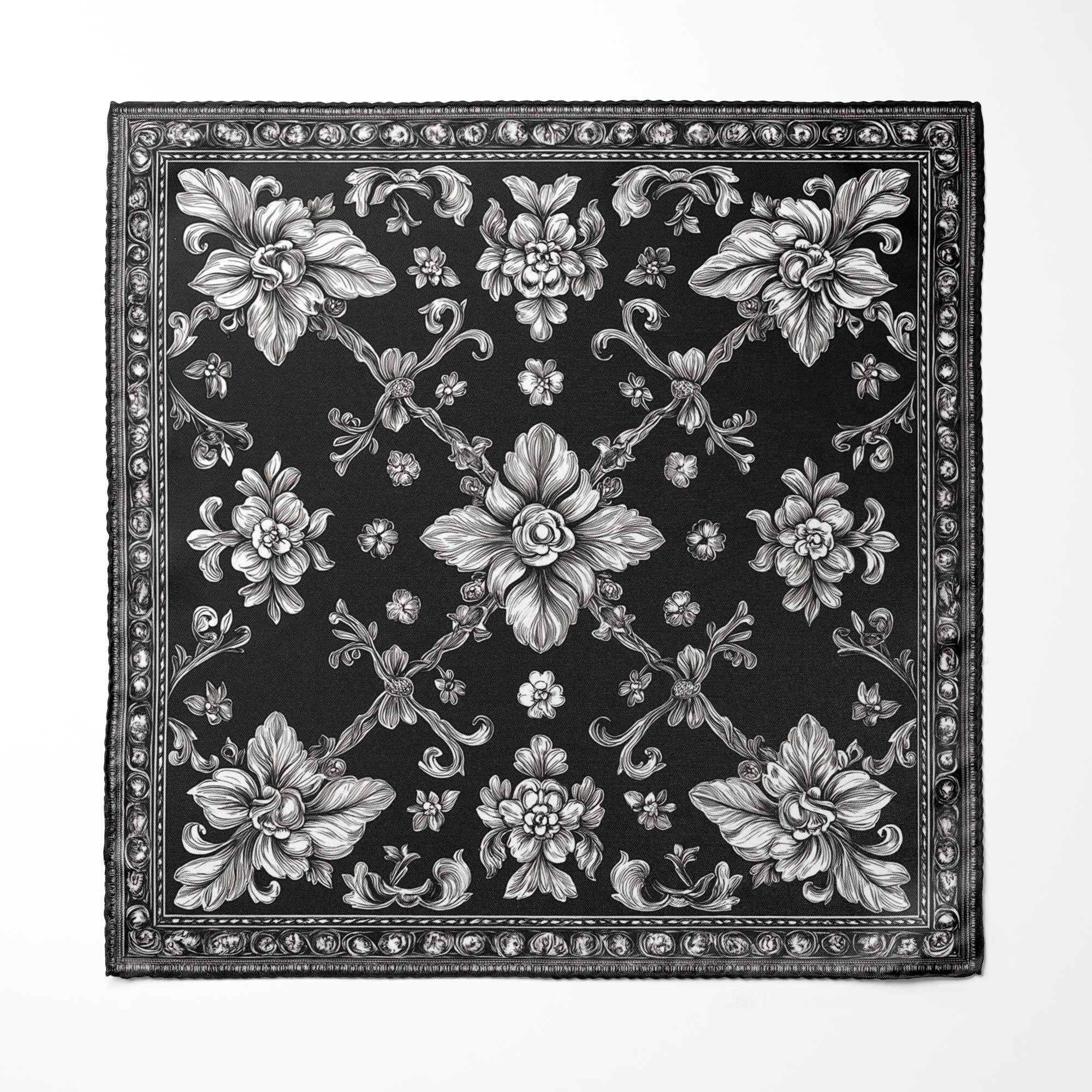 Sophisticated black pocket square adorned with a highly detailed, symmetrical floral pattern, and exudes elegance and versatility, perfect as a stylish accessory for men's suits.