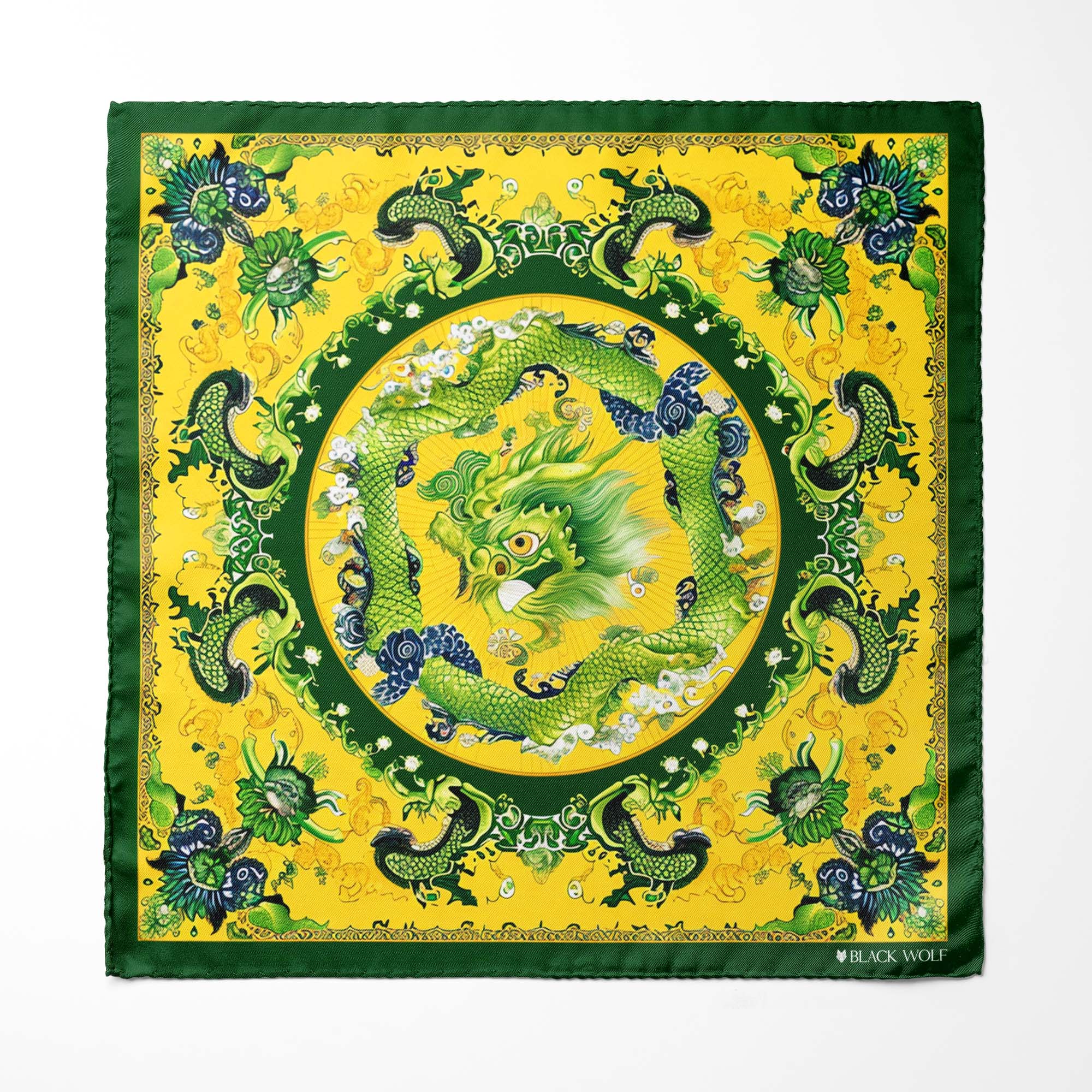 Elegant pocket square, featuring an intricate design with a central green dragon surrounded by swirling patterns and smaller dragons on a bright yellow background, radiates both elegance and versatility.