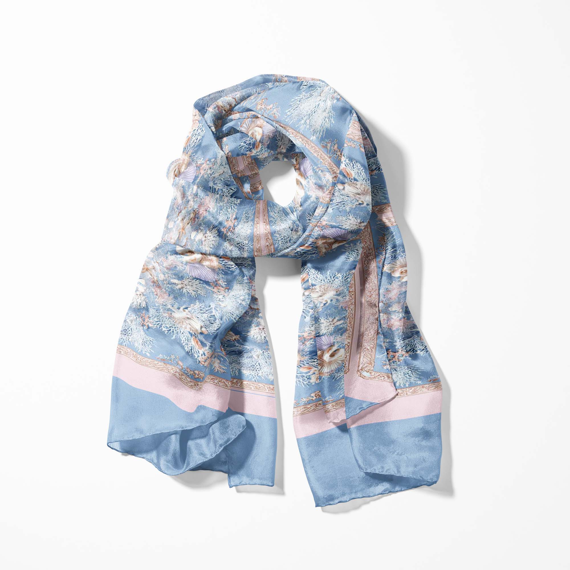 Sophisticated Scarves in soft powder blue, ivory, and blush pink, featuring delicate coral branches, seashells, and marine florals—capturing the serenity and elegance of underwater treasures.