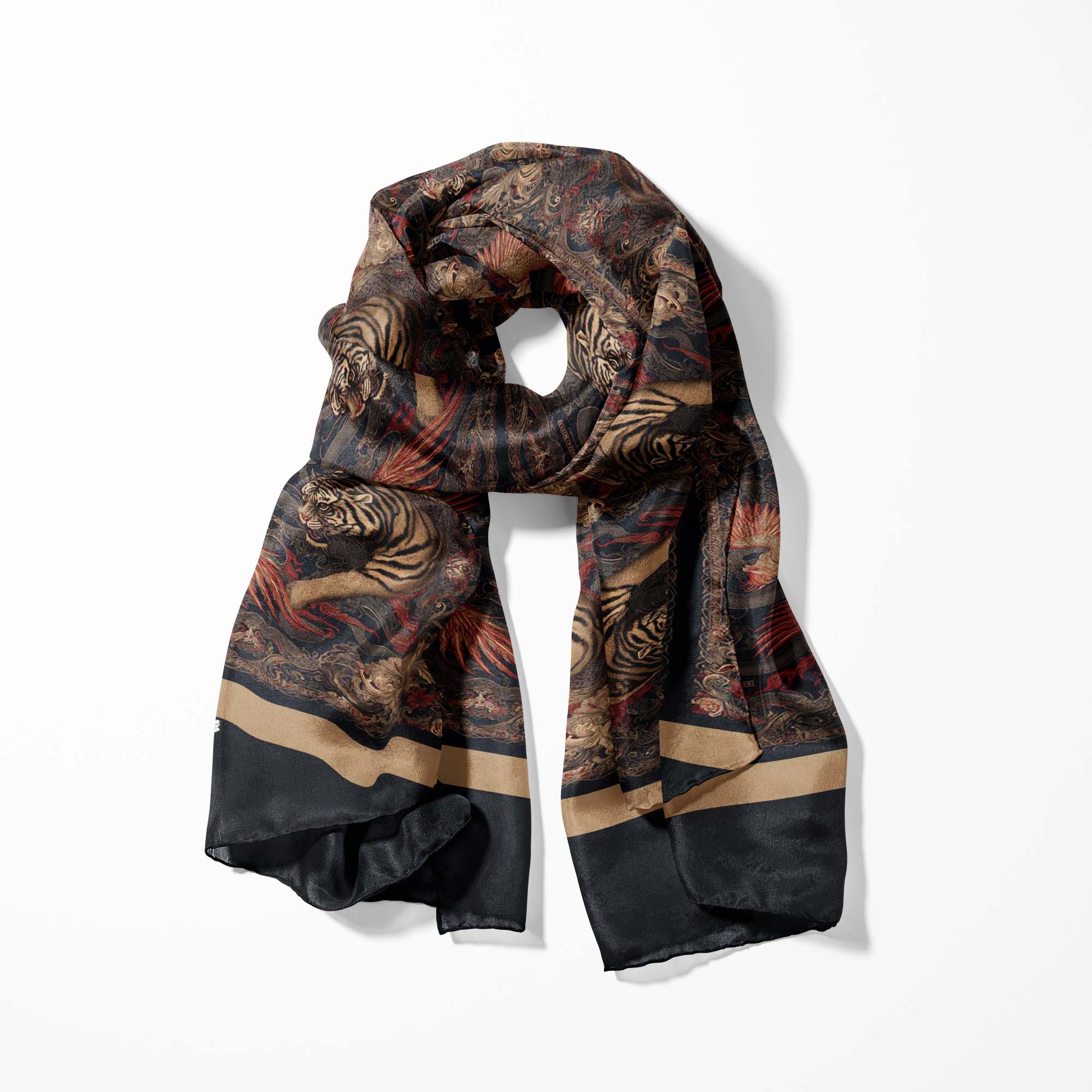 An opulent silk Scarves depicting the eternal clash and harmony between a majestic tiger and a blazing phoenix, woven in intricate mythical detail. Set against a deep obsidian backdrop with gold and crimson accents, this piece symbolizes power, balance, and transformation—a statement of fierce elegance.