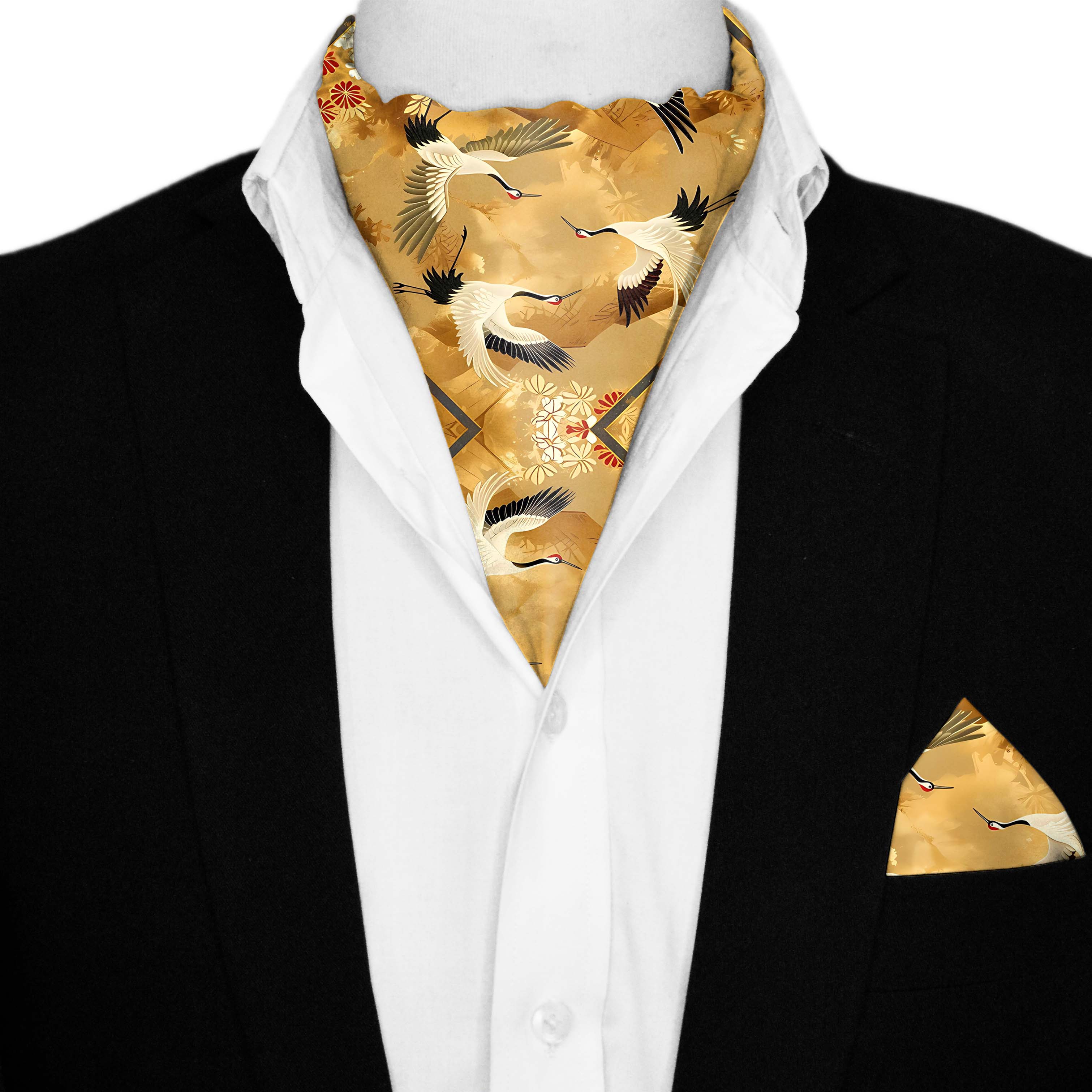 CRANE BIRDS SILK ASCOT AND POCKET SQUARE SET – PREMIUM COLLECTION