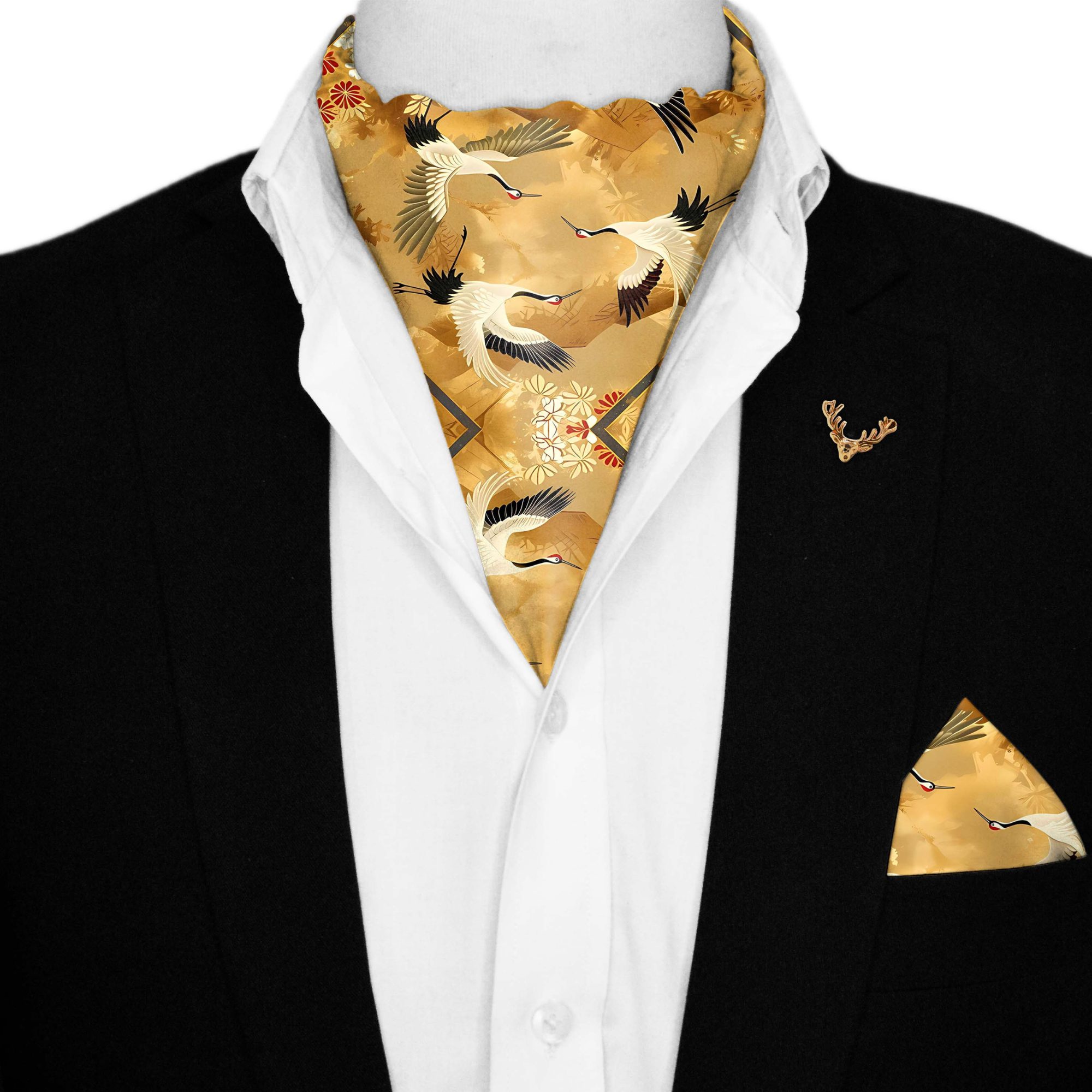 CRANE BIRDS SILK ASCOT WITH LAPEL PIN AND POCKET SQUARE