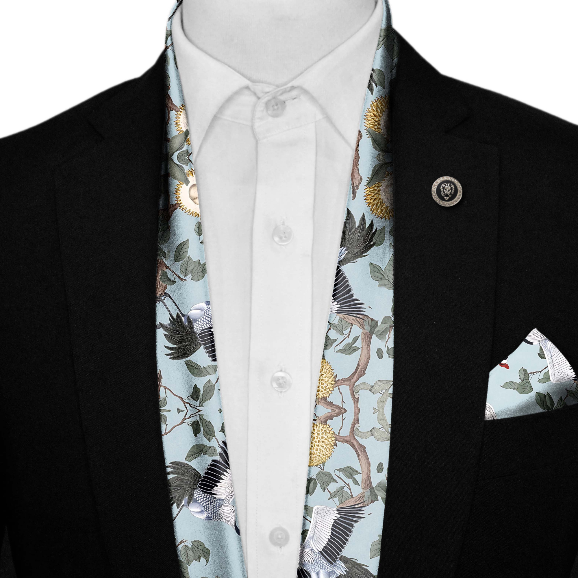 DANCING CRENIES SILK SCARF WITH LAPEL PIN AND POCKET SQUARE
