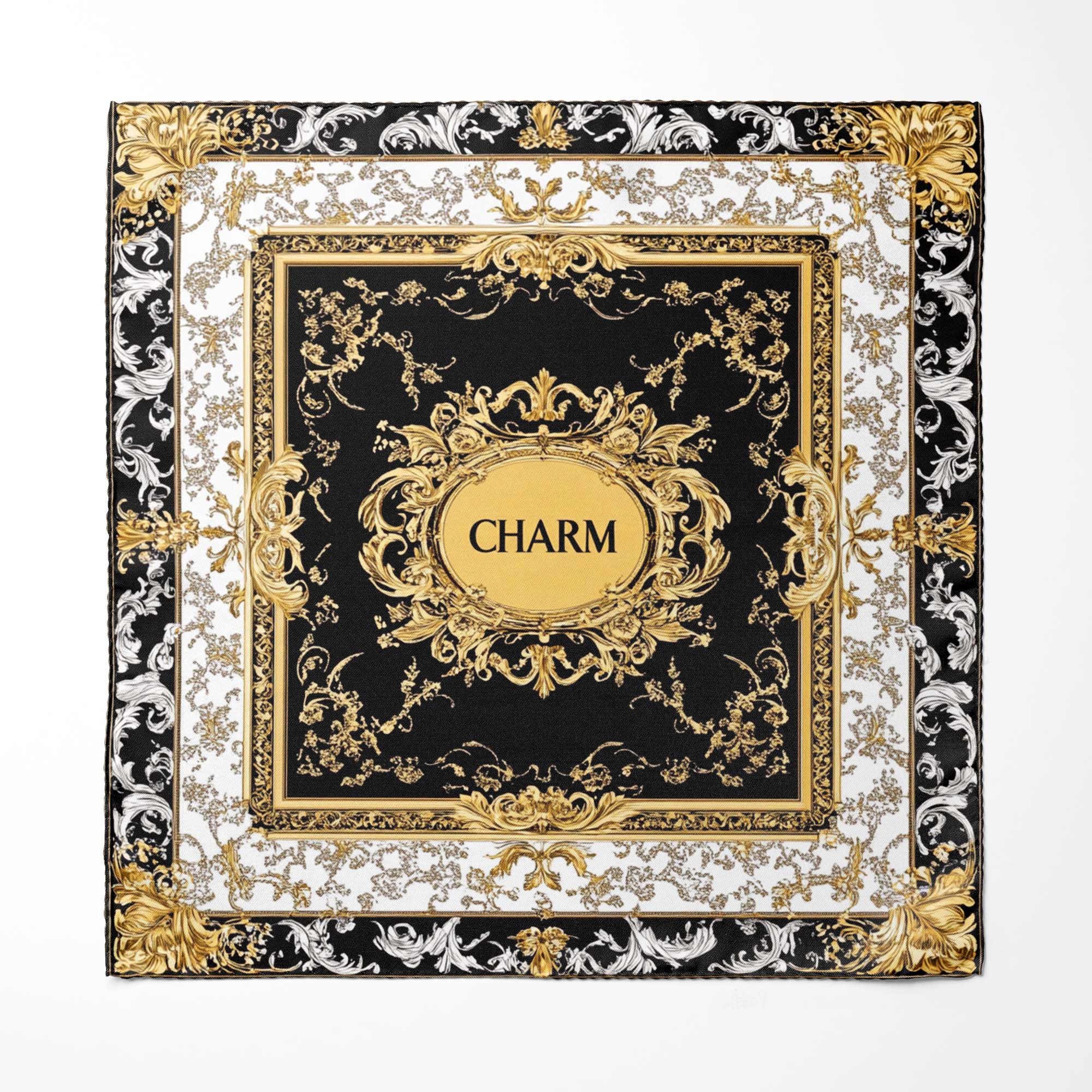 Sophisticated pocket square featuring a lavish baroque-inspired design in gold, black, and white, exuding refinement and versatility, perfect for elevating men's suits.