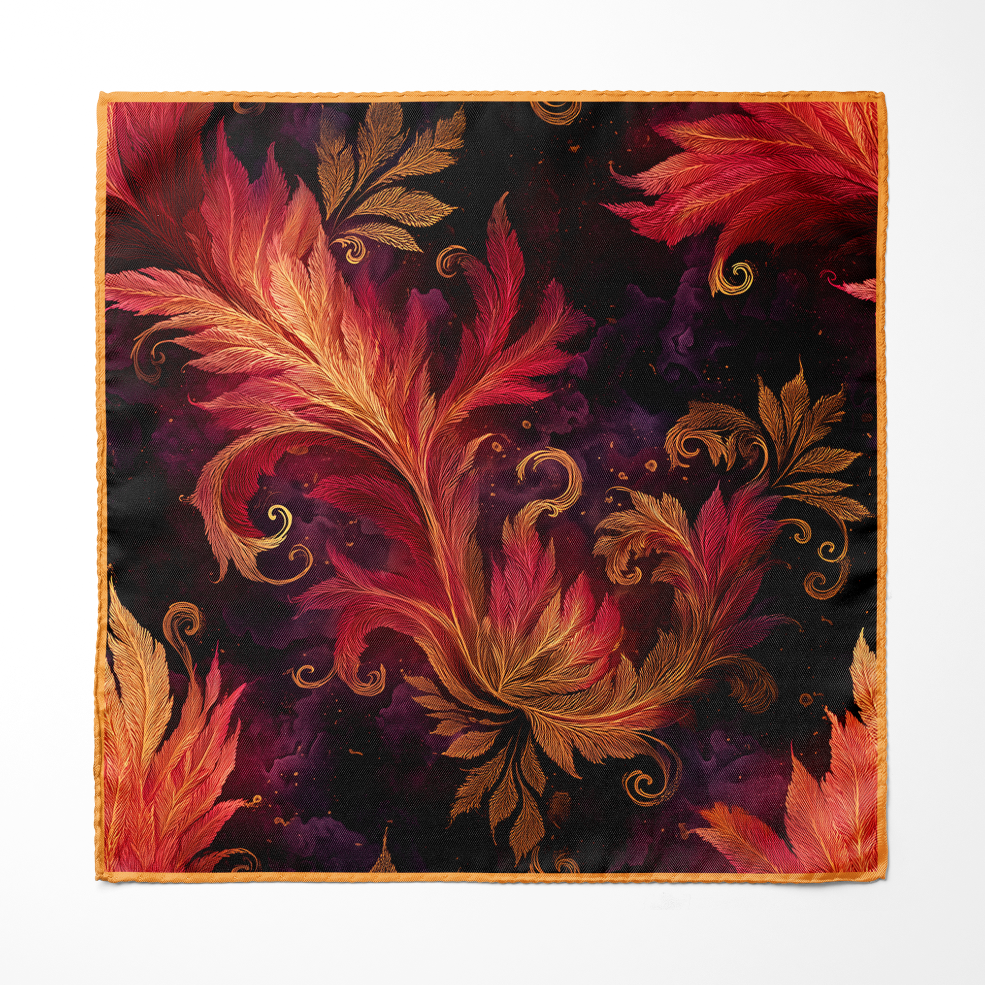 Sophisticated pocket square in fiery tones of red, orange, and gold, adorned with dramatic swirling feathers on a smoky maroon backdrop—radiating bold elegance and flair.