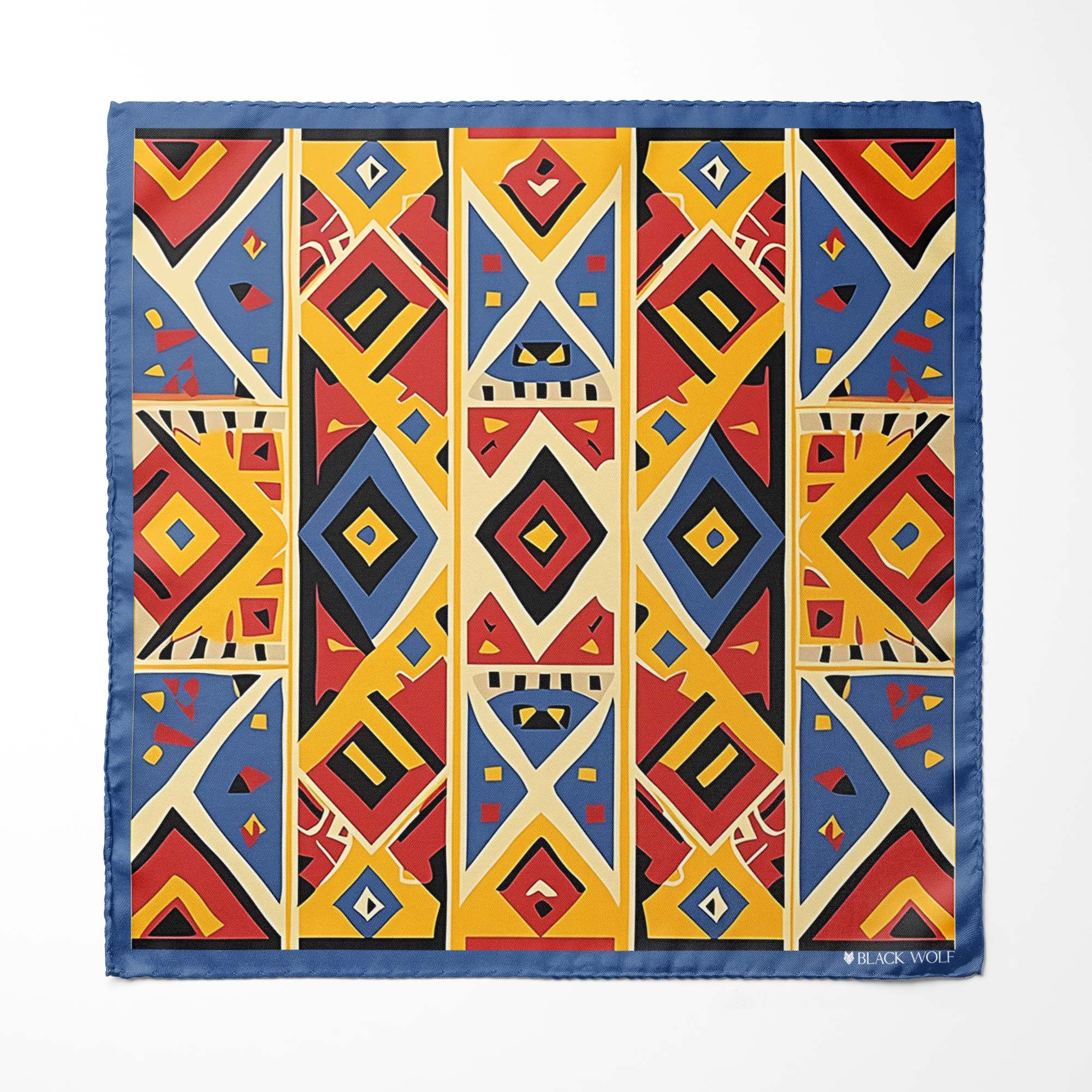 Sophisticated pocket square featuring a vibrant, geometric pattern in bold colors red, yellow, blue, black, and beige. With its symmetrical layout of triangles, diamonds, and rectangles, it embodies both refinement and versatility.