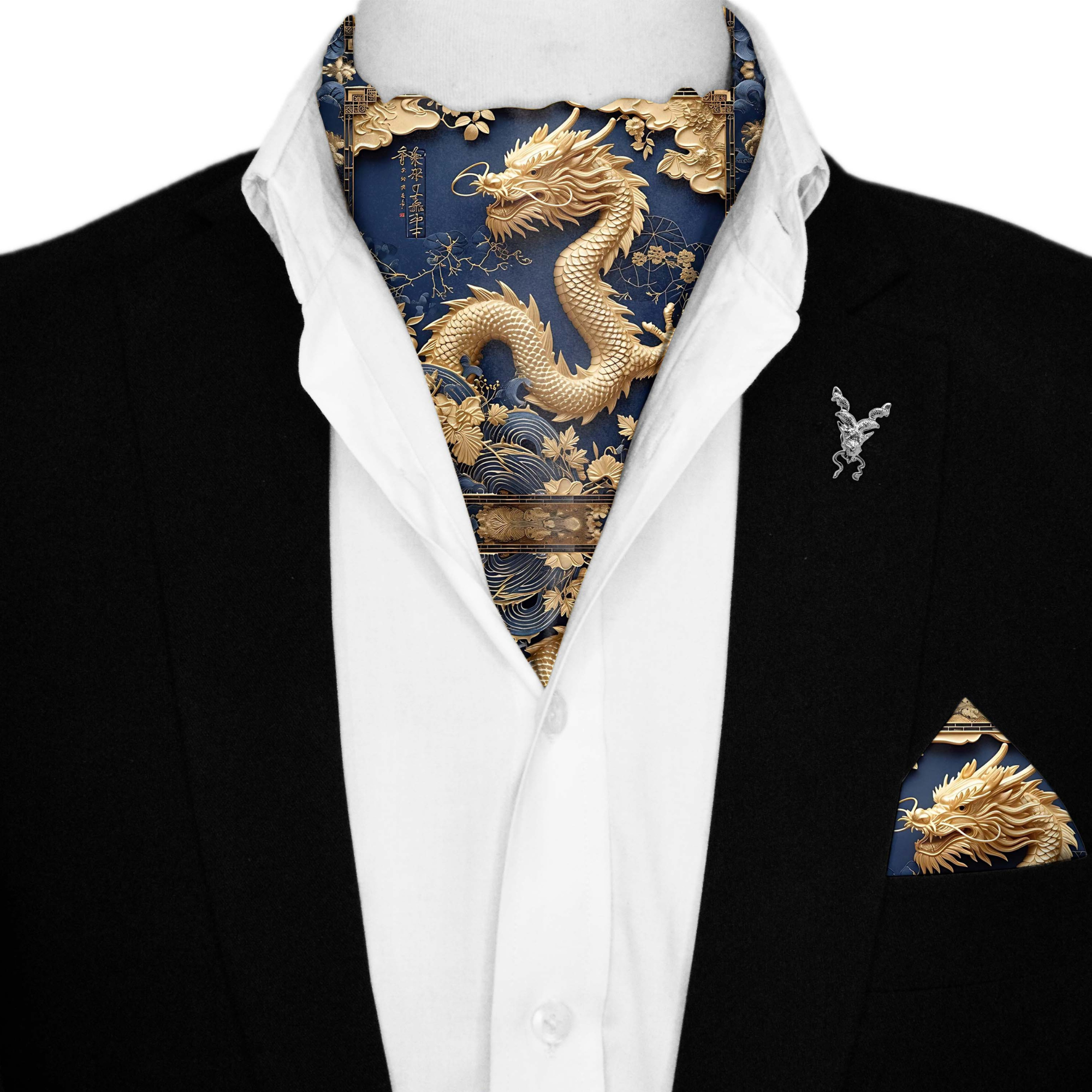 GOLD DRAGON SILK ASCOT WITH LAPEL PIN AND POCKET SQUARE