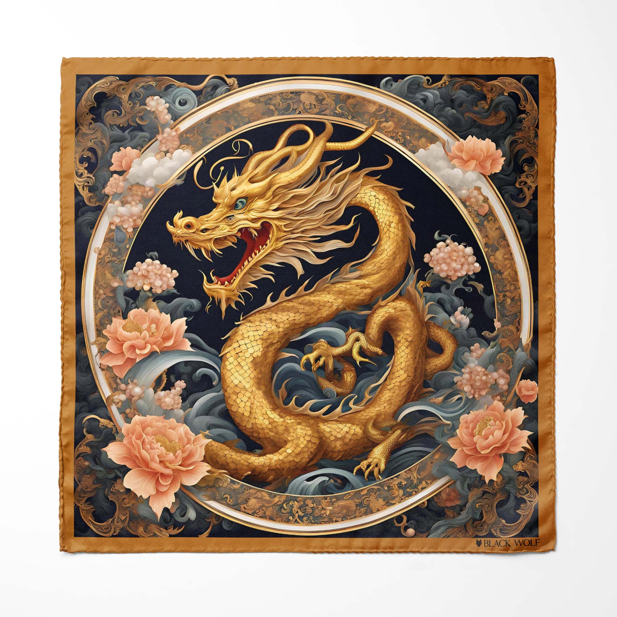 Elegant pocket square featuring a golden dragon with detailed scales and fierce expression, surrounded by swirling clouds and blooming peonies in pink and peach against a navy blue background.