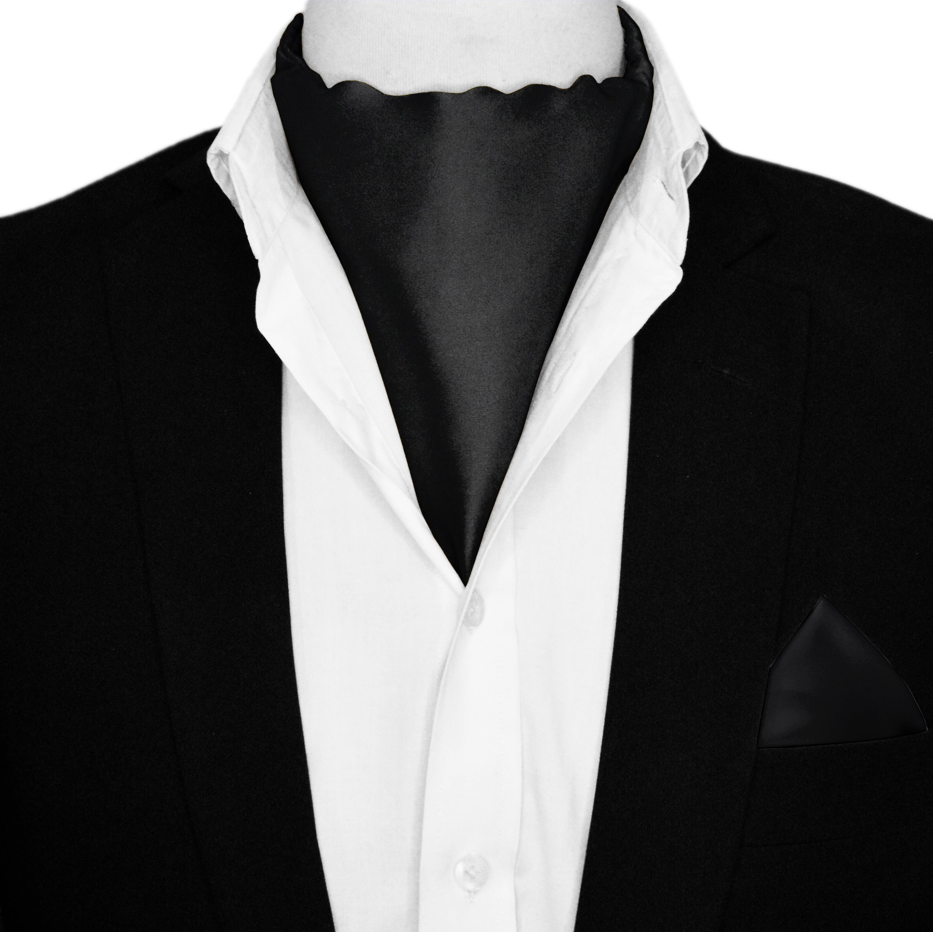 Indulge in elegance with our jet black silk ascot and pocket square. Effortlessly elevate your style with the enchanting solid color, lightweight fabric, and versatile design, making it perfect for any occasion