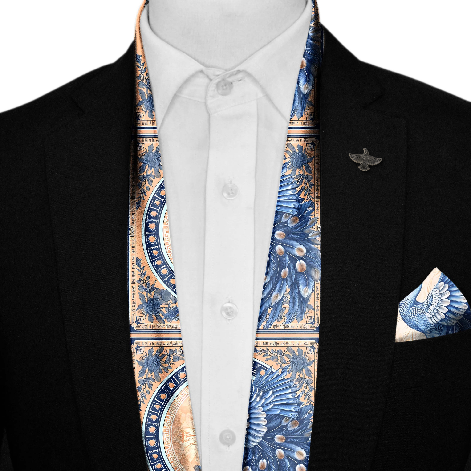 LUXURY CHINOISERIE SILK SCARF WITH LAPEL PIN AND POCKET SQUARE