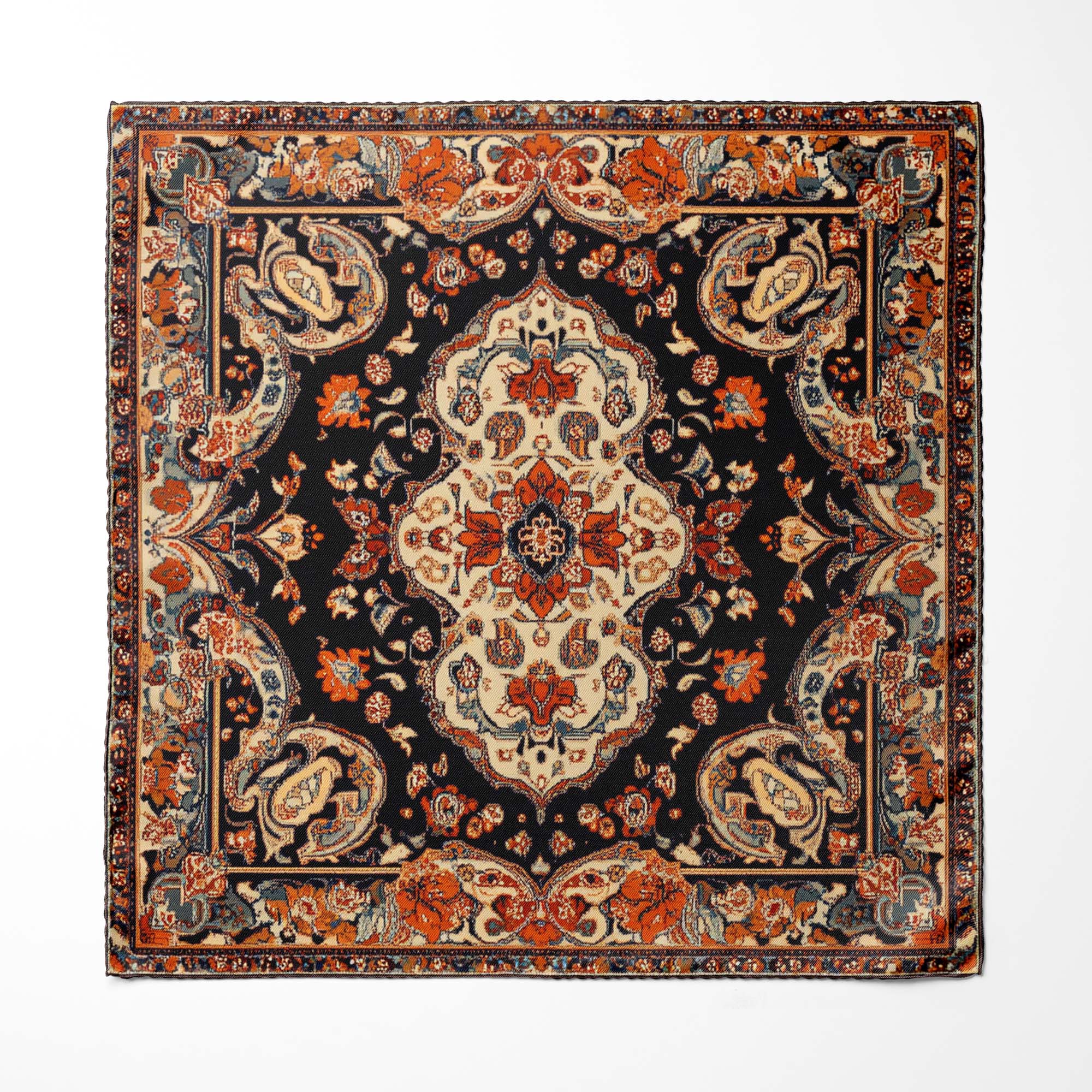 Sophisticated pocket square featuring a cream central medallion adorned with rich orange and deep navy blue floral motifs, exuding elegance and versatility, perfect for enhancing men's suits.