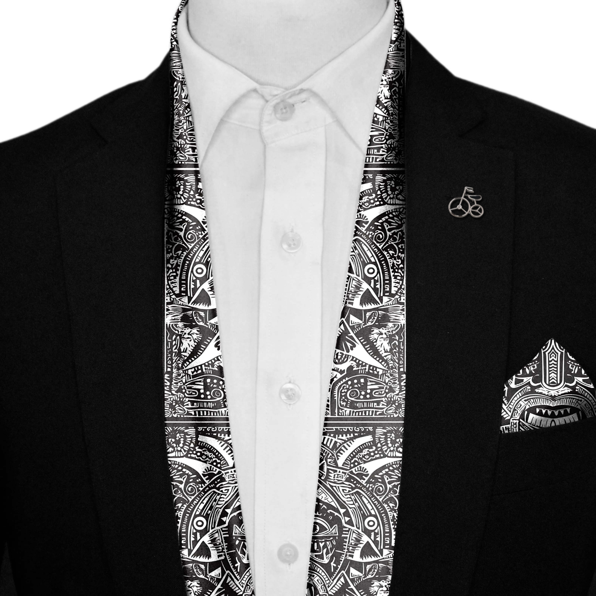 MAYAN PATTERN SILK SCARF WITH LAPEL PIN AND POCKET SQUARE
