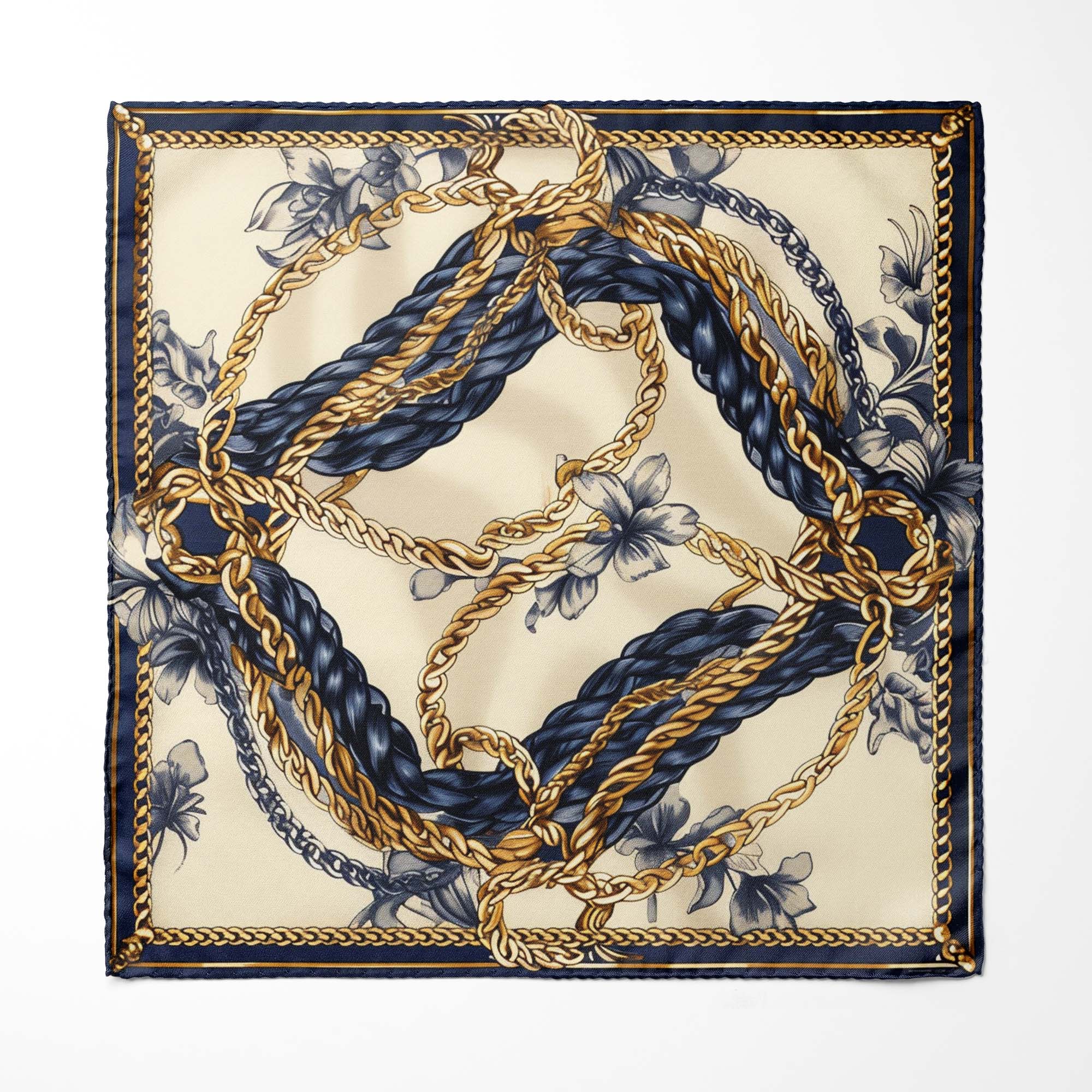 Sophisticated pocket square featuring interwoven ropes in gold and navy, accented by delicate floral elements in muted gray and black. Exudes timeless elegance and versatility, perfect as a coat pocket handkerchief.