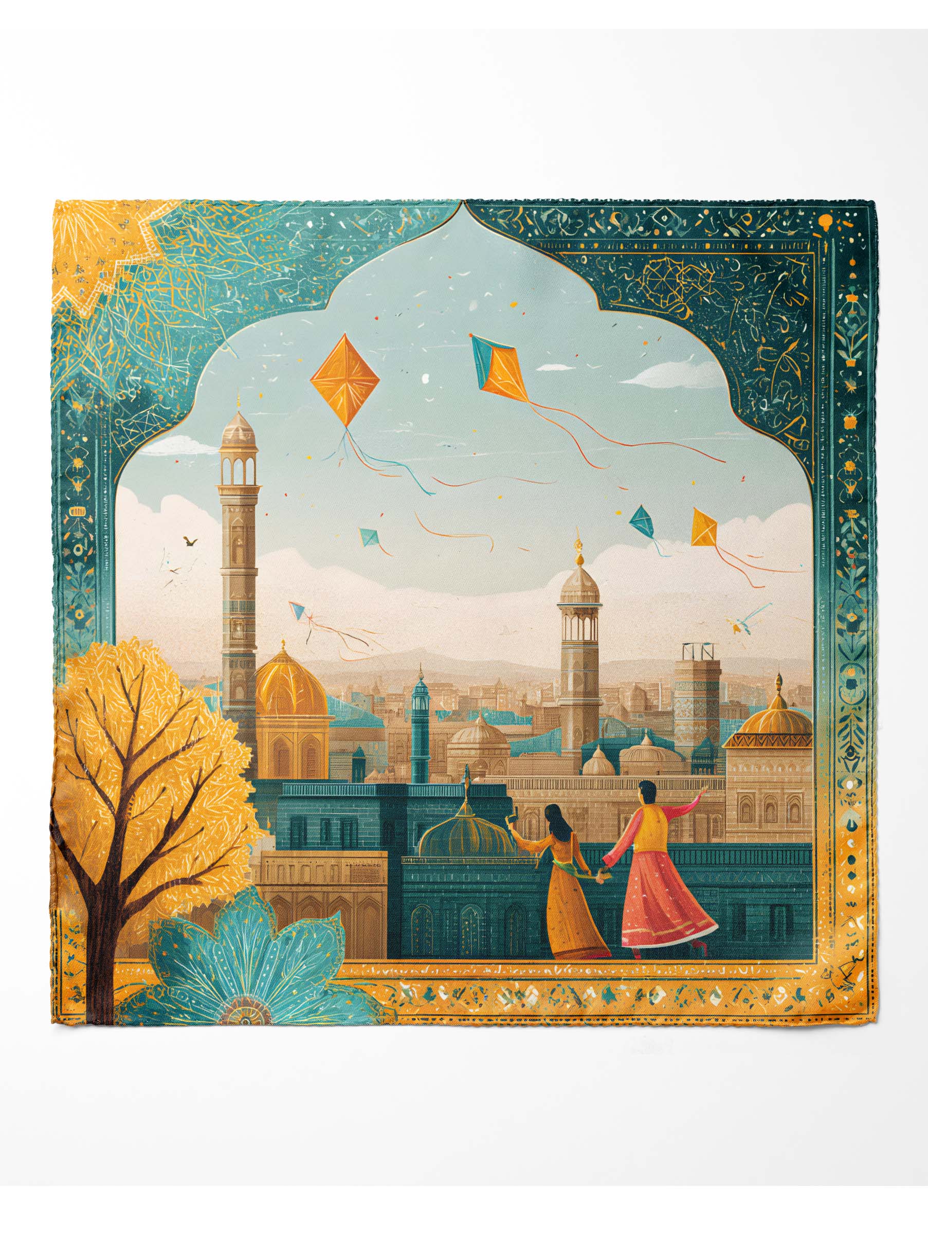 Bring the joyful spirit of Lahore Basant to your wardrobe with this beautifully illustrated Premium Basant Scarf, inspired by traditional rooftops, colorful kites, Mughal architecture, and festive celebrations. Designed especially for women who love culture, color, and class.