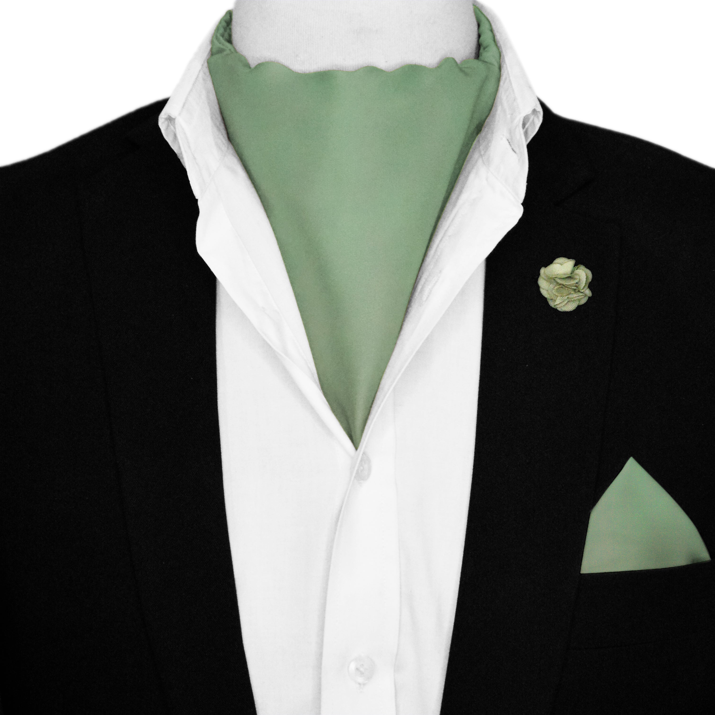 OLIVE LIGHT GREEN SILK ASCOT WITH LAPEL PIN AND POCKET SQUARE