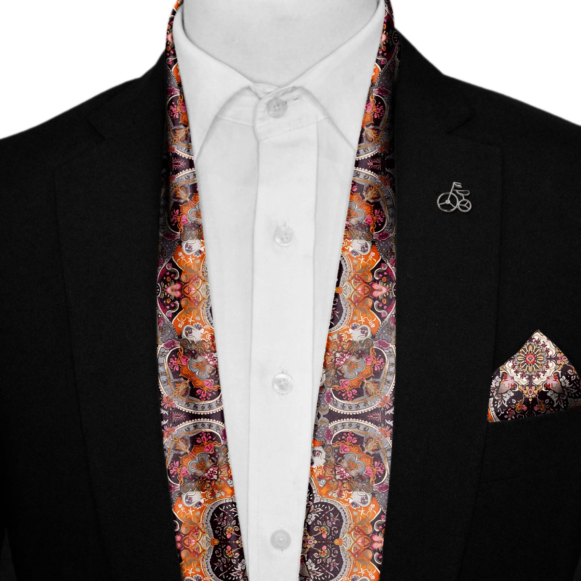 ORNAMENTAL PAISLEY SILK SCARF WITH LAPEL PIN AND POCKET SQUARE