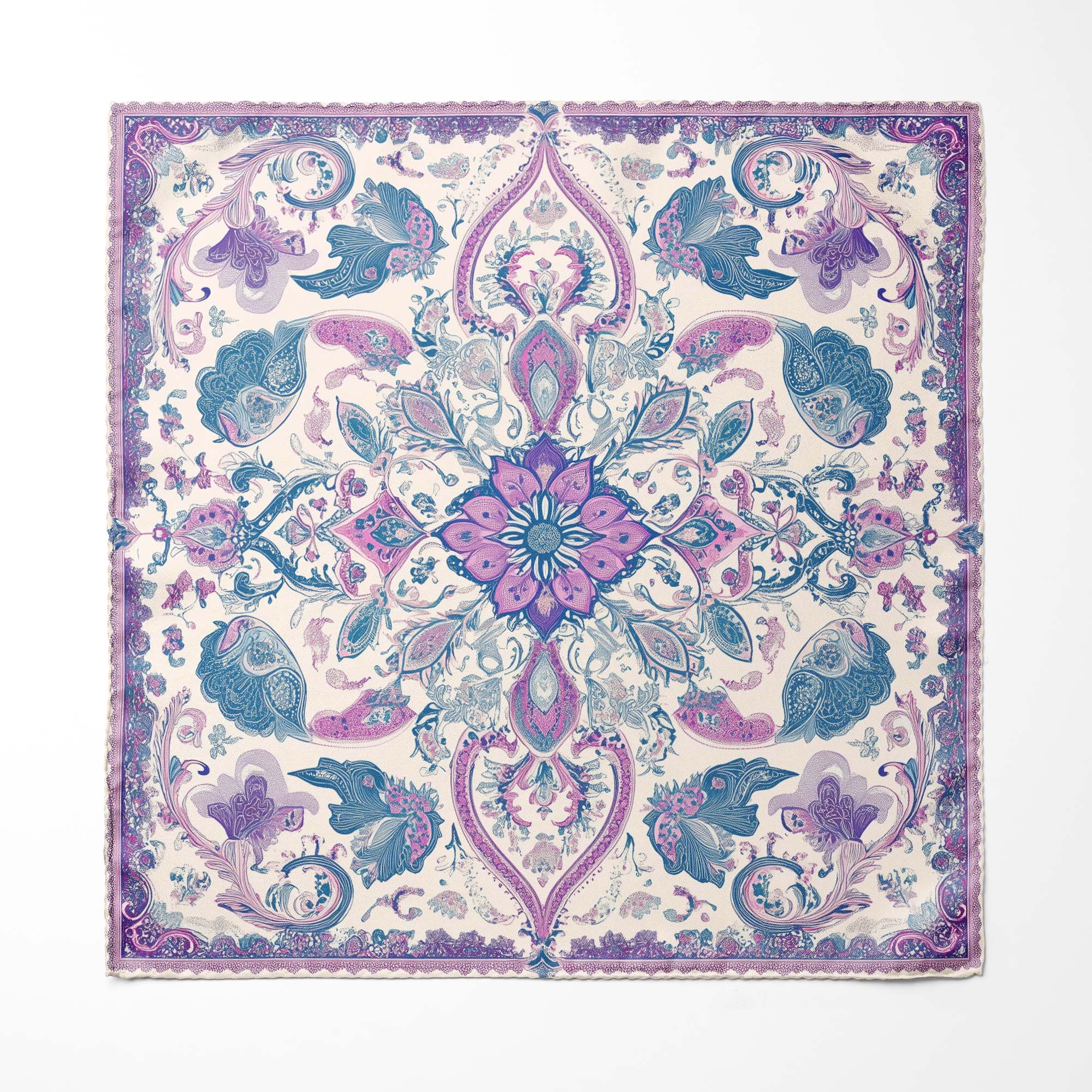 Elegant pocket square, featuring a detailed paisley and floral pattern in pastel shades of pink, purple, blue, and teal, embodies grace and versatility, suitable for any upscale occasion.