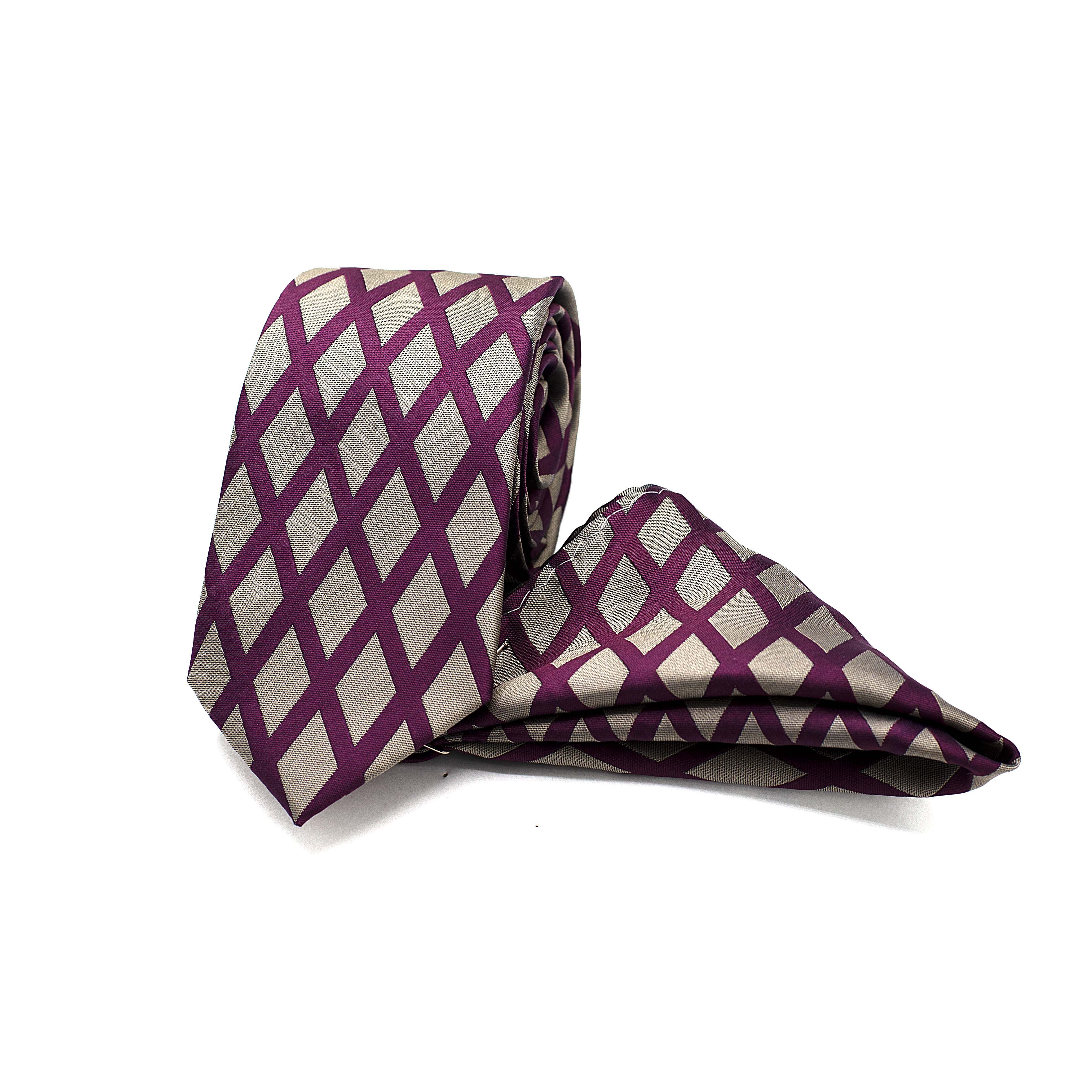 PURPLE DIAMOND GRID TIE AND POCKET SQUARE SET