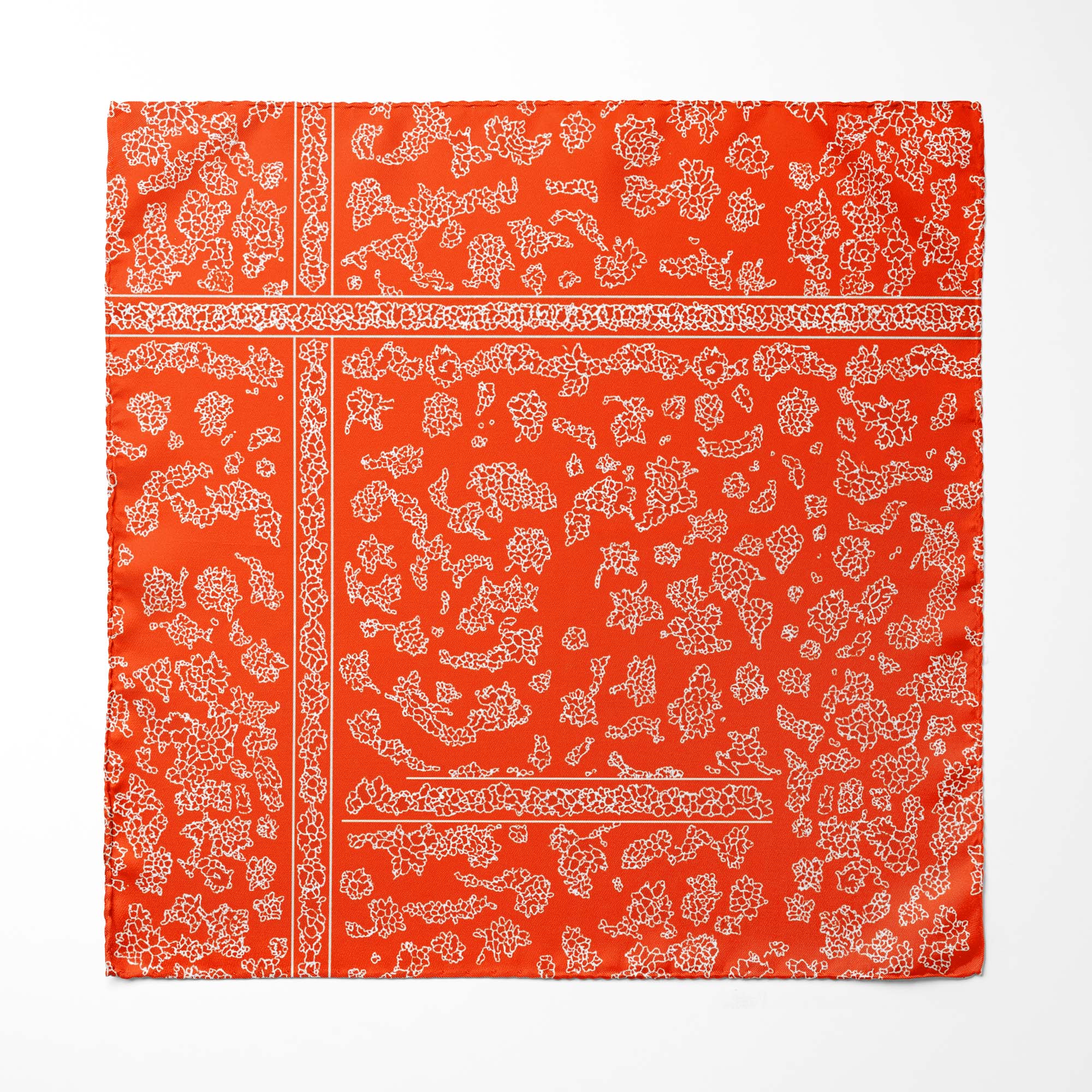 Elegant pocket square adorned with detailed lacework and textured white floral patterns, set against a striking orange background, exuding sophistication and versatility for any men's ensemble.