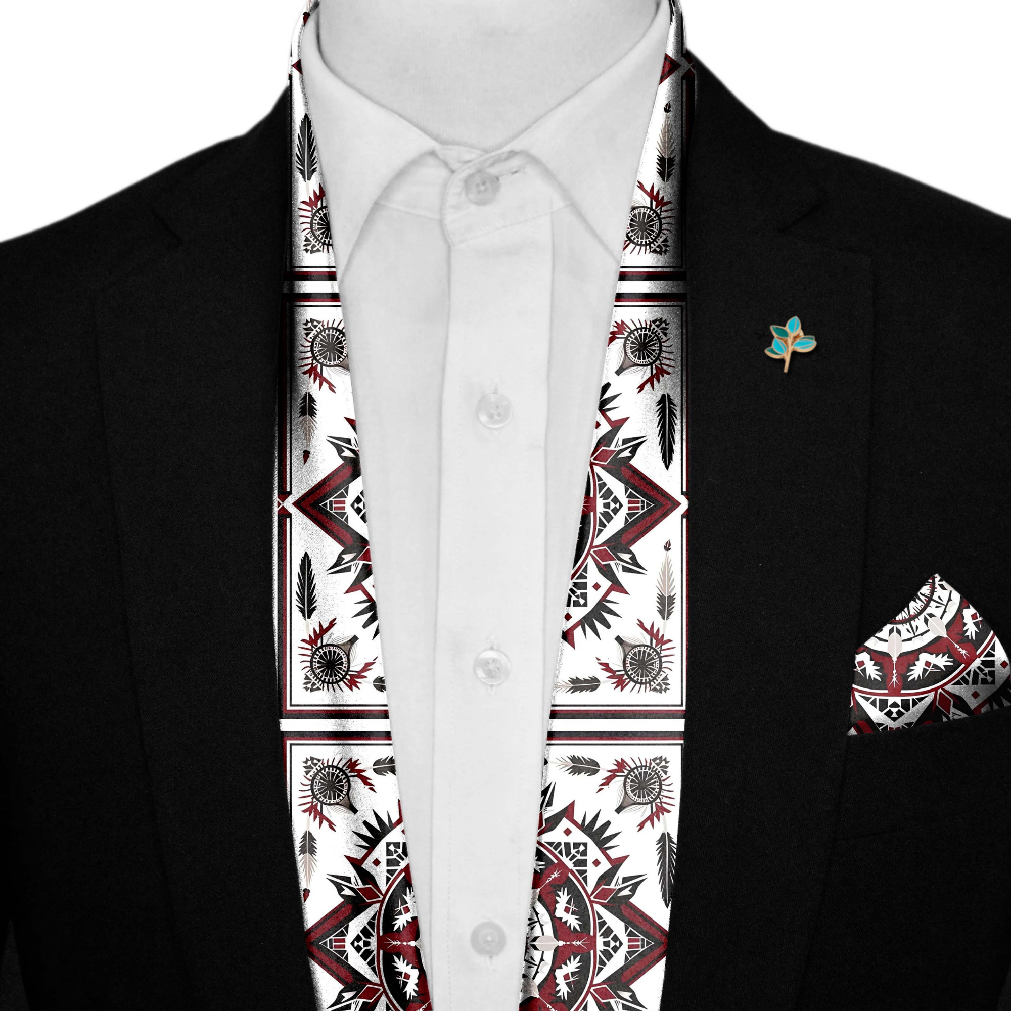 RED ALPANA DESIGN SILK SCARF WITH LAPEL PIN AND POCKET SQUARE