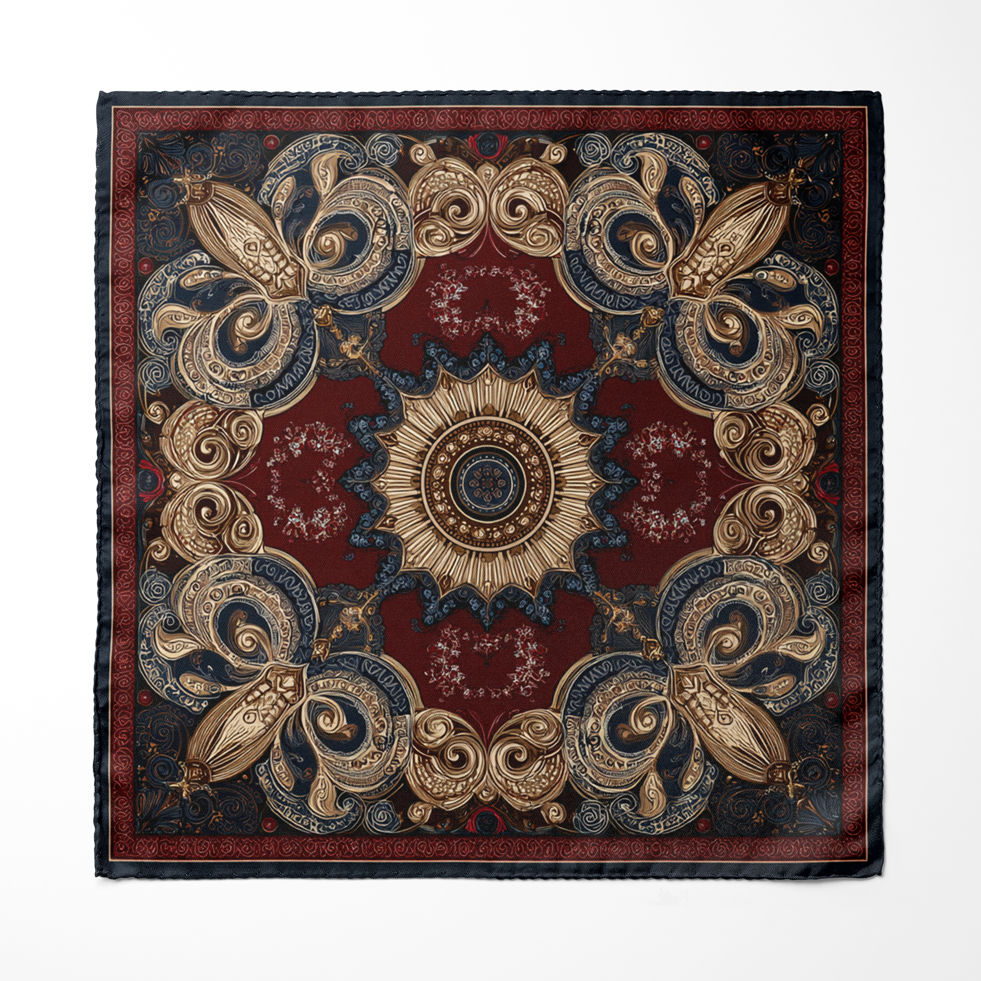 Striking pocket square in rich burgundy, deep navy, and antique gold, showcasing an ornate central medallion with elaborate scroll motifs—exuding regal charm and refined sophistication for any distinguished ensemble.