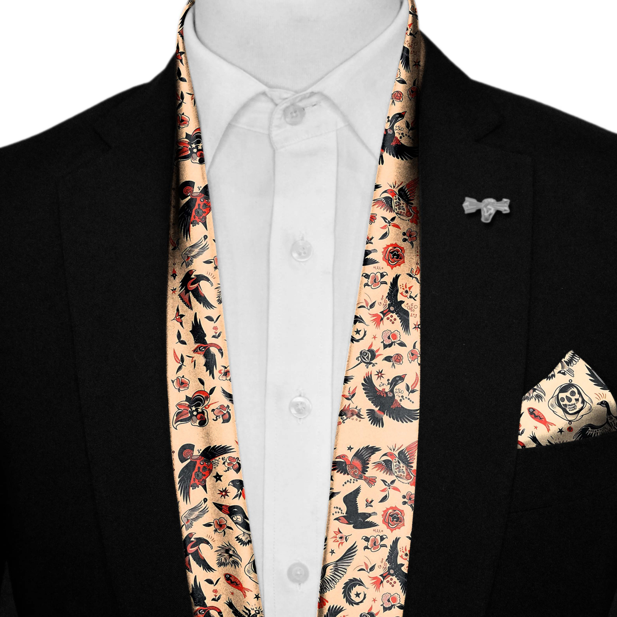 TATTOO FLASH BANDANA SILK SCARF WITH LAPEL PIN AND POCKET SQUARE