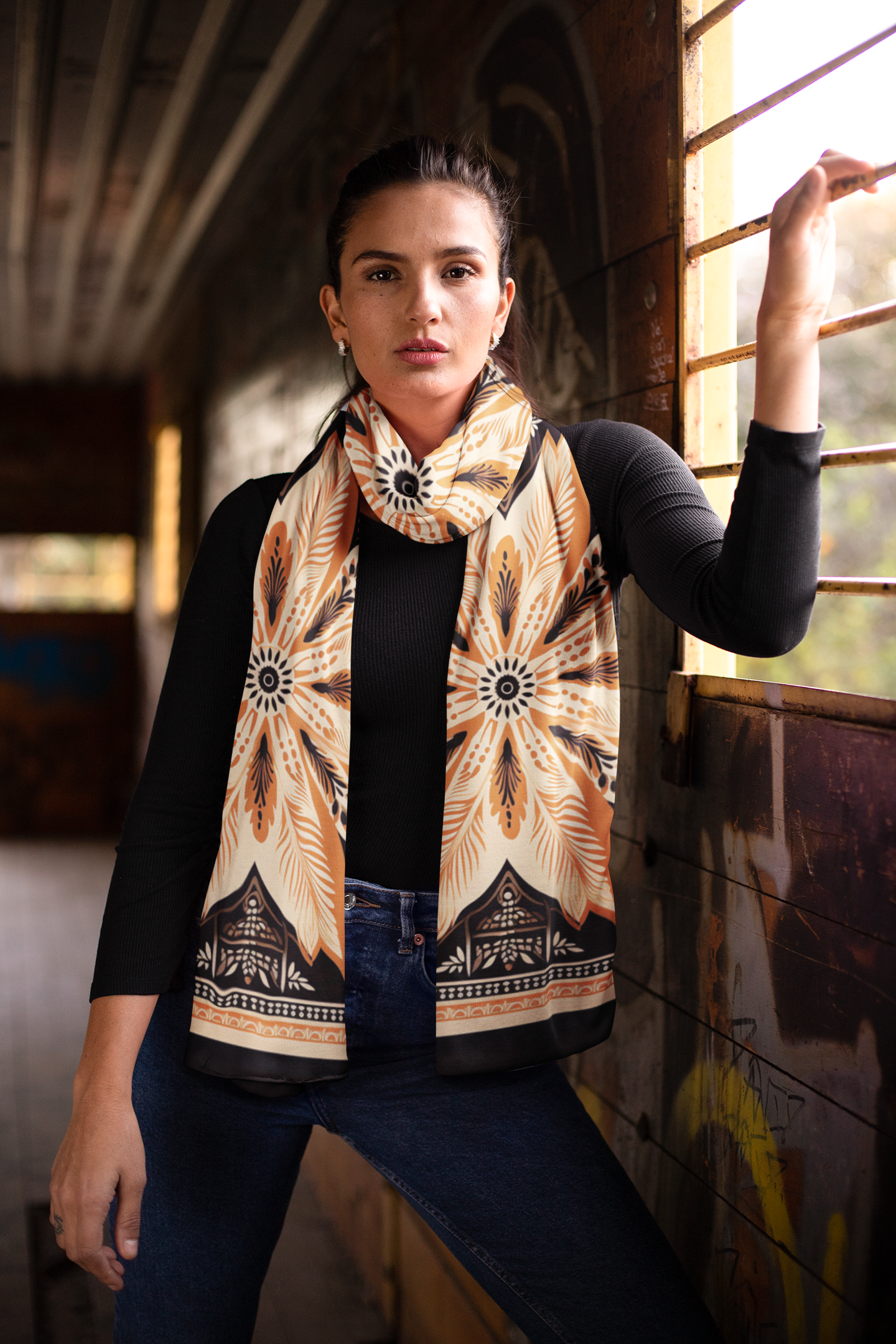 Black silk scarf infused with ethnic vintage theme can be a stylish and sophisticated choice for a fashion-forward look. Silk scarfs exhibit a matte finish on one side and a glossy sheen on the other. This combination offers a stunning luminosity and a silky drape, making them ideal for both party and formal wear. Additionally, they stand out as an excellent choice to complement wedding outfits.