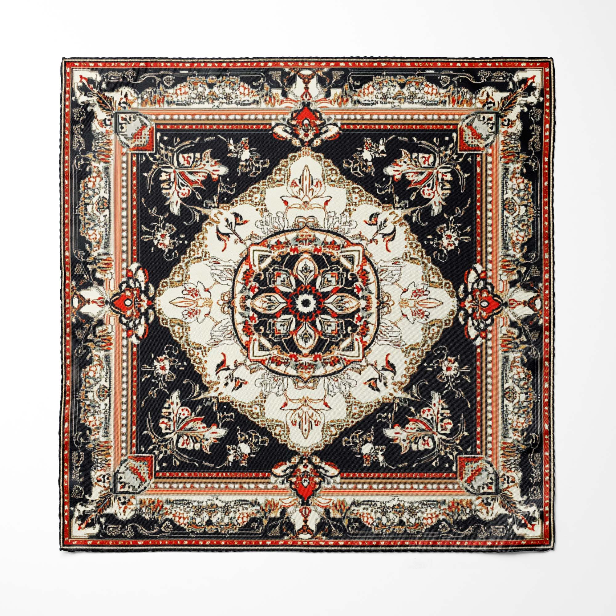 Refined pocket square, featuring an ornate medallion surrounded by intricate floral and paisley patterns in rich hues of red, black, and cream, exuding an aura of opulence and timeless appeal. The elegant border, highlighted by gold accents, enhances its luxurious aesthetic.