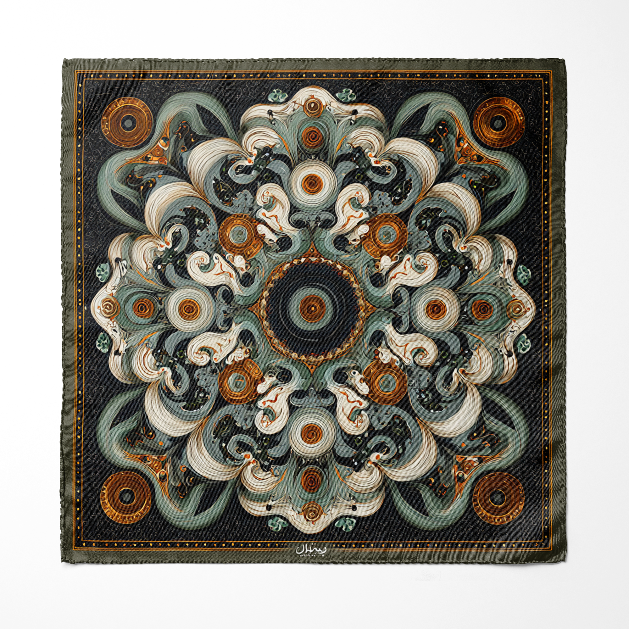 An exquisite silk pocket square featuring an intricately drawn mandala in shimmering antique gold on a deep black backdrop. The detailed circular motifs radiate elegance and cultural depth—an ode to classical craftsmanship fused with bold, modern flair. A truly timeless piece for the discerning gentleman.