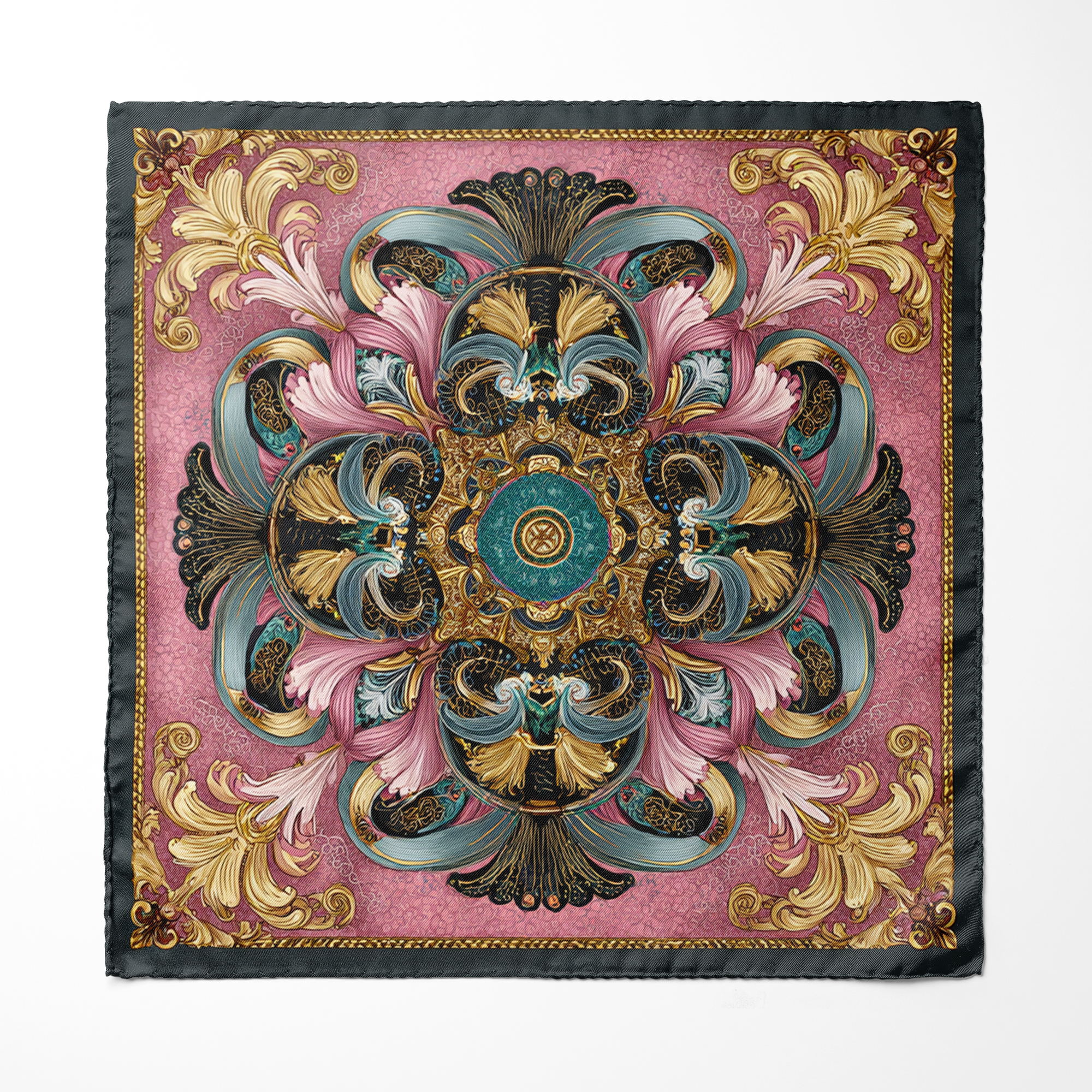 A luxurious silk pocket square featuring an intricate Renaissance-inspired medallion motif. Accents of teal, gold, blush, and black create a lavish floral arrangement over a textured pink backdrop—blending classic elegance with modern detail.