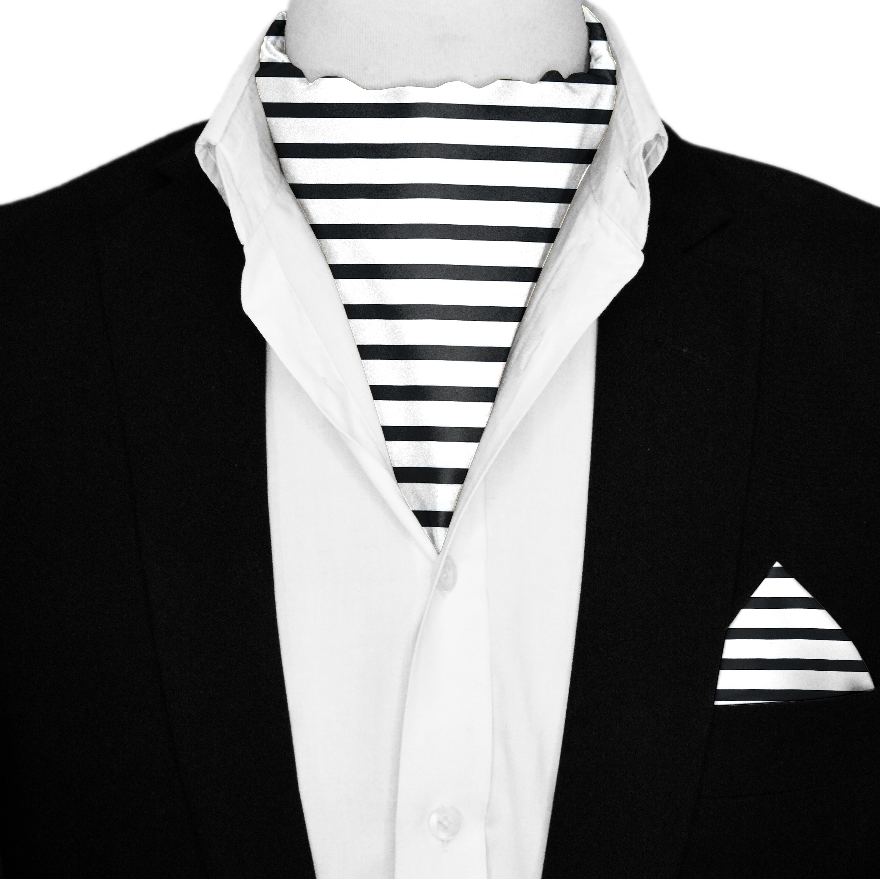 Indulge in elegance with our white stripes silk ascot and pocket square. Effortlessly elevate your style with the enchanting solid color, lightweight fabric, and versatile design, making it perfect for any occasion